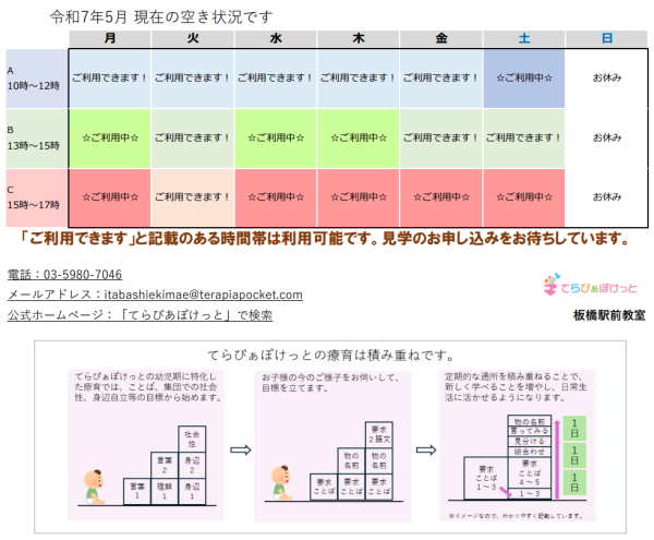 利用枠の空き情報です 2025/05/03(土) 令和7年5月の最新の空き情報です。埋まってきた時間帯がある一方で、新たに受け入れを増やした時間帯があります。近隣での療育をお探しの際は参考になさって下さい。 お知らせ一覧